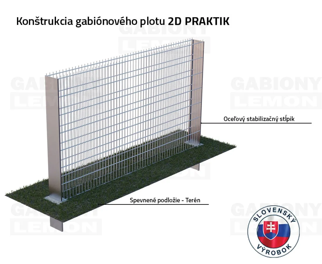 Gabiónový plot Praktik sa skladá z dielov dlhých 250 cm s hrúbkou 19cm. Jeden diel obsahuje dva bodovo zvárané 2D plotové panely s okom 5×20 cm, dva oceľové pozinkované gabiónové stĺpiky, dištančné háčiky a montážne skrutky+matice. Gabión je od výroby ošetrený kvalitnou povrchovou úpravou Zinok, prípadne Zinok + RAL farba antracit/hnedá/čierna, ktorá ho chráni pred koróziou na 50+ rokov. Gabión je dodávaný v demonte.