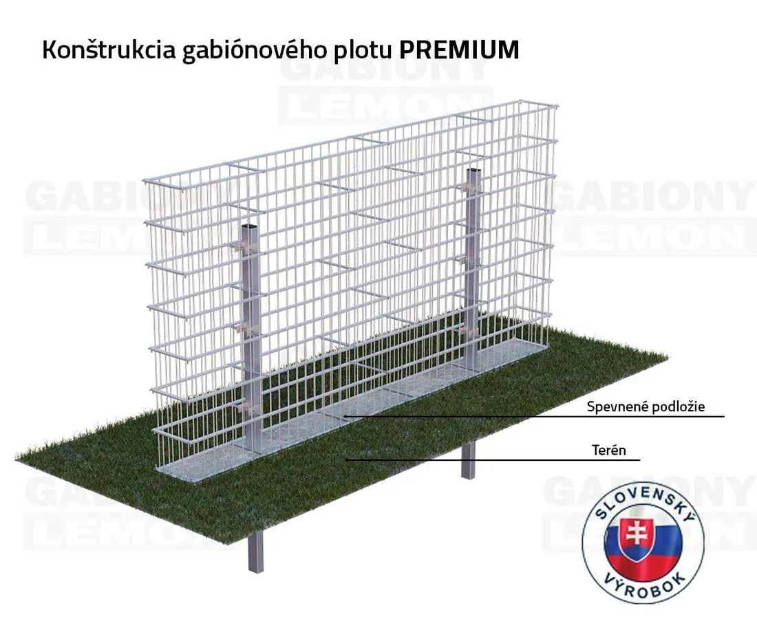 Gabiónový plot PREMIUM sa skladá z 250 cm dlhých panelov s variabilnou hrúbkou (od 20 – 40 cm) a variabilnou výškou (od 40 – 240 cm) v násobkoch po 20cm. (Pri väčších výškach plotu – 220 cm a 240 cm – je dĺžka jedného panelu (250 cm) zložená z dvoch panelov.)